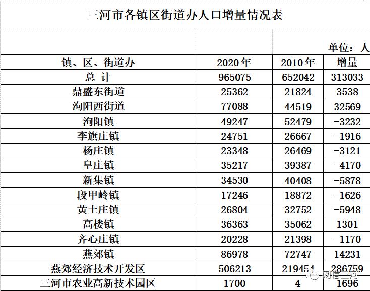 与2010年六普各镇、区、街道人口数据相比,人口呈现6个增加8个减少的态势。人口增加的6个镇、区、街道为燕郊高新区、泃阳西街道、燕郊镇、鼎盛东街道、农业园区和高楼镇,分别增加286759人、32569人、14231人、3538人、1696人和1301人(西市区的四个街道人口数量并入高新区计算)。城镇人口的大量增加和乡村人口的逐步减少是造成我市城镇化率增高的主因(详情见下表)。
