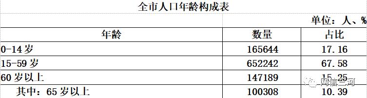 从分年龄段人口数占比情况看,我市人口结构呈现健康的正态分布形态,特征是“两头小,中间大”。全市15-59岁人口占比最大,共652242人,占比为67.59%。其次为0-14岁人口,共165644人,占比为17.16%。全市60岁及以上人口为147189人,占比为15.25%,其中65岁及以上人口为100308人,占10.39%(见下表)。