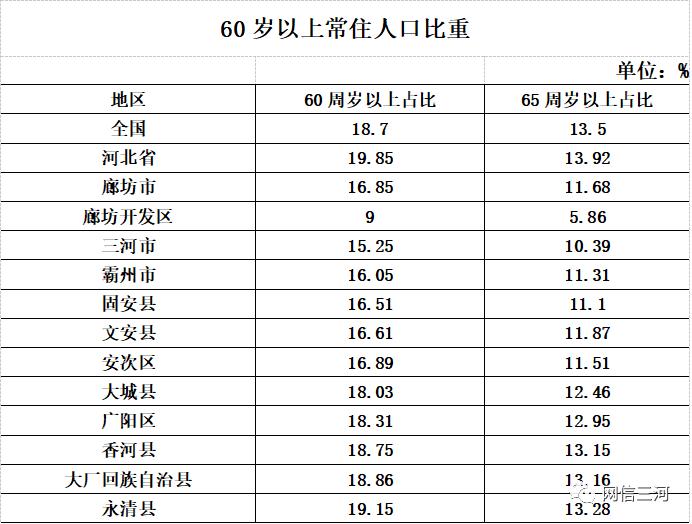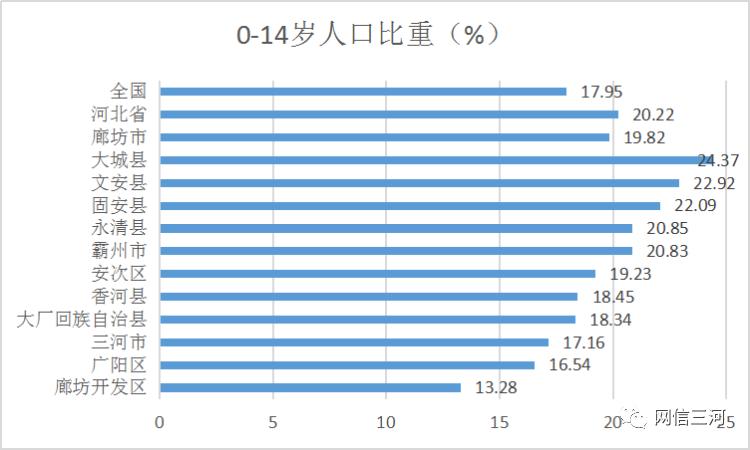 虽然0-14岁人口比重较2010年提高3.84个百分点,但在廊坊市位居倒数第三位,仅比廊坊开发区(13.28)和广阳区(16.54)略高,同时分别低于全国、河北省和廊坊市0.79、3.06和2.66个百分点(见下图)。