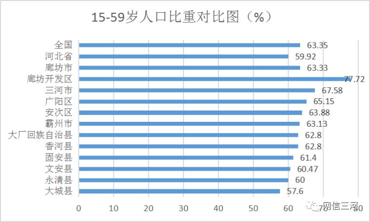 我市15-59岁占比相对2010年有所减少,但我市该年龄段人口比例高于全廊坊市4.26个百分点,仅次于廊坊开发区(77.72%),在廊坊市位居第二位,同时高于全国和全省4.24和7.67个百分点,丰富的劳动力人口资源为我市经济持续稳定发展奠定了良好的人口基础(见下图)。