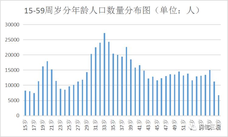 从15-59岁年龄的人口分布数量来看,31-39岁年龄段所占比重较大,其中峰值人口为33岁。