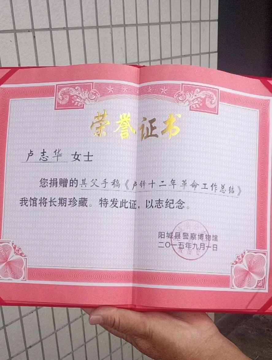 在整理父亲的遗物时,我发现父亲写的“卢铎十二年工作简结”(1942-1954年)。仔细阅读,我惊呆了。原来父亲是为党做地下工作的,那个大药房是我党的秘密情报站,是组织为掩护父亲工作、以父亲的名义开设的。父亲对党忠心耿耿、忍辱负重,从不计较个人得失,为党的事业做出了特殊贡献。早知如此我在学校也该扬眉吐气了。我问母亲为什么不告诉我们,母亲淡定地说“有规定,不让说”。轻轻六个字,使我对母亲肃然起敬,满眼泪水夺眶而出。父亲的工作离不开母亲的支持与配合,父亲所取得的成就,有母亲的一半。