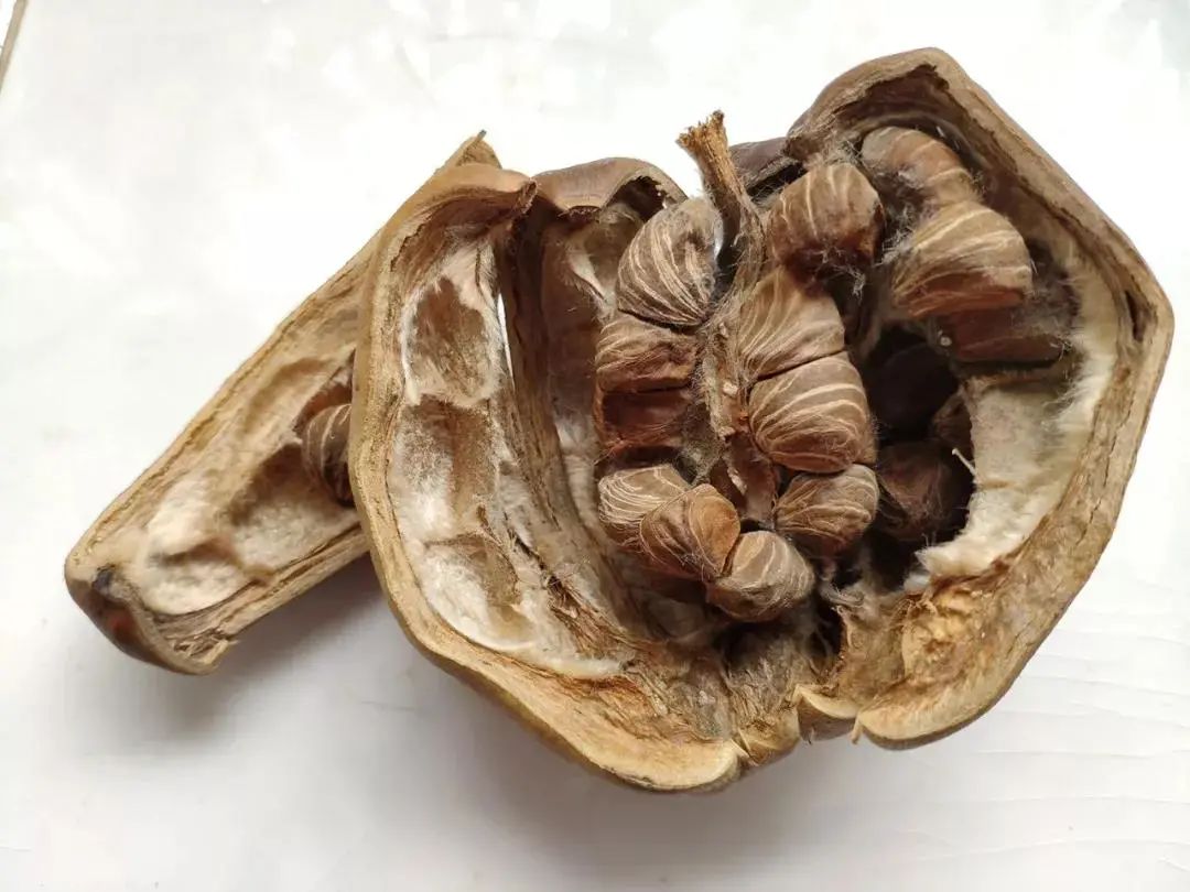 裂开的光瓜栗果实,可以看到棉毛 | 含笑