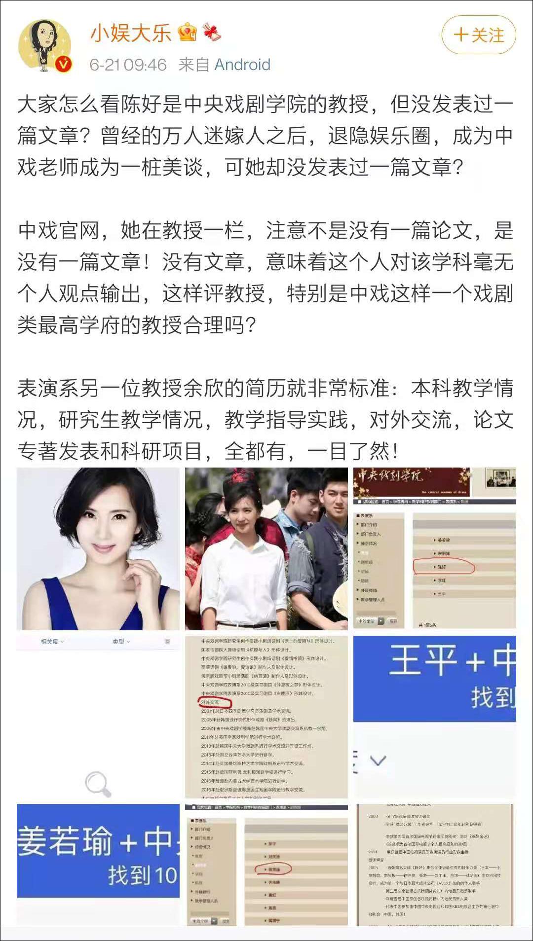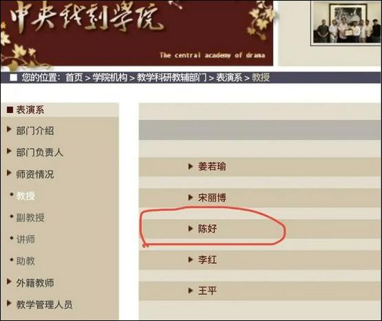 6月21日,微博娱乐博主@小娱大乐 发文称,陈好的名字出现在了中戏官网的“教授”一栏,但是她一篇论文,甚至一篇文章都没有发过。