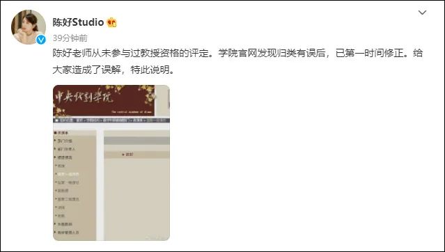 晚间,陈好工作室官方微博@陈好Studio 回应称,陈好从未参与过教授资格的评定。学院官网发现归类有误后,已第一时间修正。给大家造成了误解,特此说明。