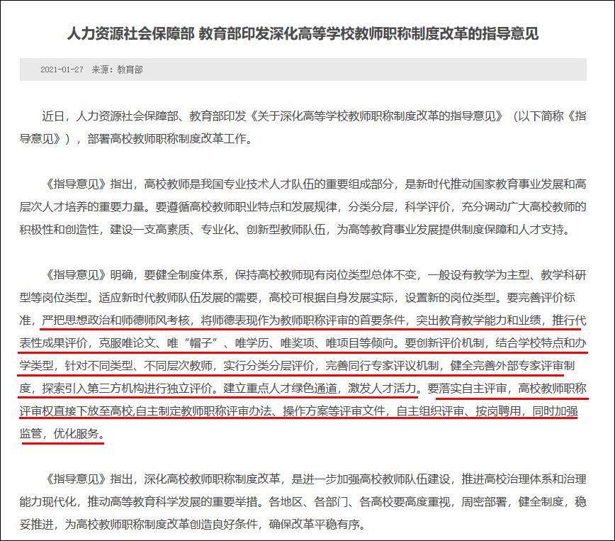 但在今年1月27日,我国教育部、人力资源教育部《关于深化高等学校教师职称制度改革的指导意见》(以下简称《指导意见》)。根据教育部相关负责人答记者问,《指导意见》出台的背景之一,就是上述的《高等学校教师职务试行条例》“存在评价标准和评价机制不够完善等问题,需要进一步巩固成果、改革完善。”
