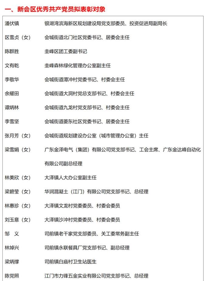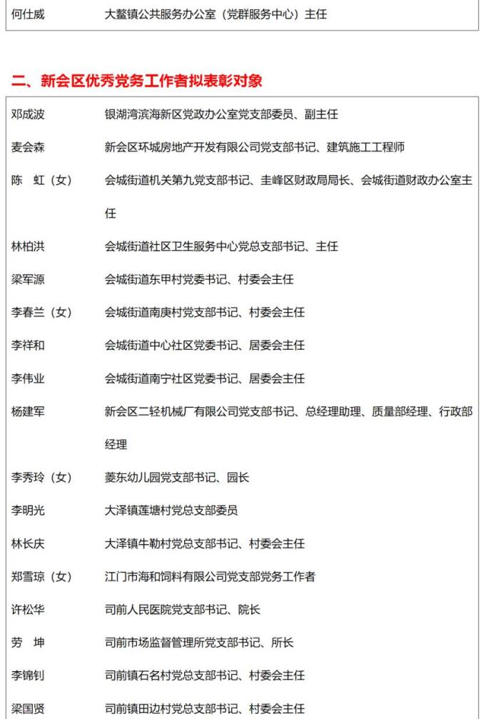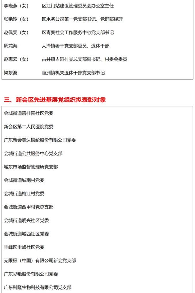 关于新会区优秀共产党员、新会区优秀党务工作者、新会区先进基层党组织拟表彰对象的公示