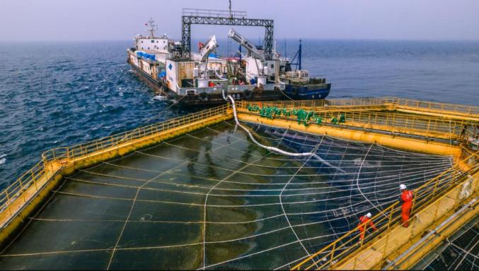 “深蓝一号”网箱中,三文鱼平均体重超4千克/条,品质达到欧盟出口标准。