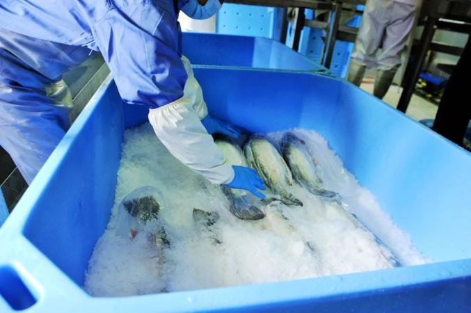 包装工人将鱼用透明长袋装起,有序摆进蓝色专用保温箱。