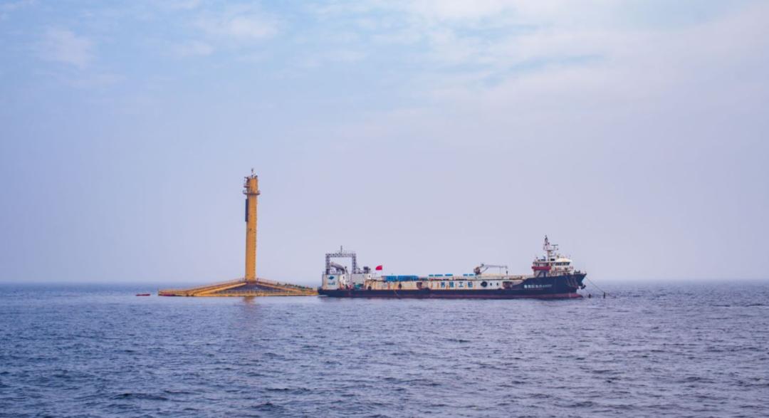 巨大的白色养殖工船驶近“深蓝一号”,这也是全球首艘远海作业三文鱼加工船。三文鱼会通过这条白色管道被吸上船来。