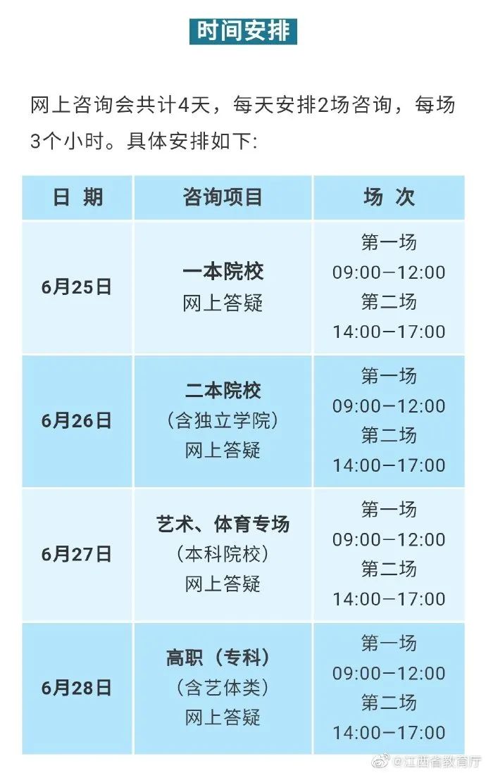 为指导考生科学合理填报志愿,加大高招政策宣传力度,省教育考试院将举办“江西省2021年普通高考志愿填报网上咨询会”。网上咨询会共计4天,每天安排2场咨询,每场3个小时。