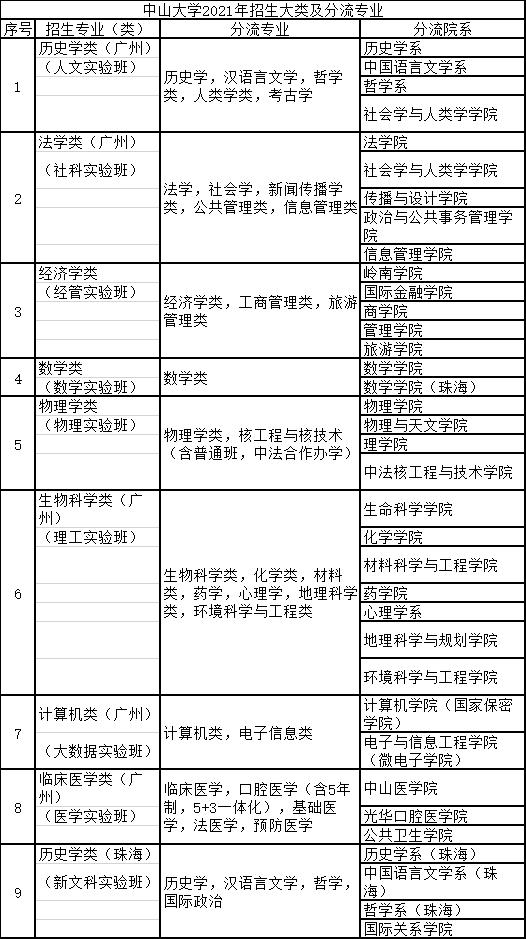 中山大学还公布了2021年招生大类及分流专业: