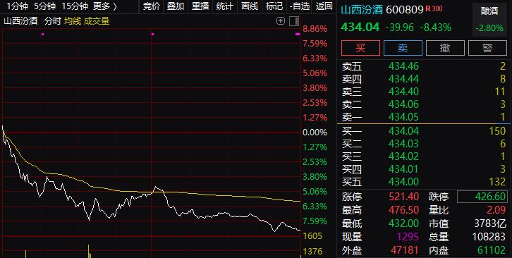 今天以白酒为首的消费股全面走低。其中,山西汾酒跌幅最具象征意义,该股今天大跌超8%,技术上已经破位。整个白酒板块蒸发近1500亿元。