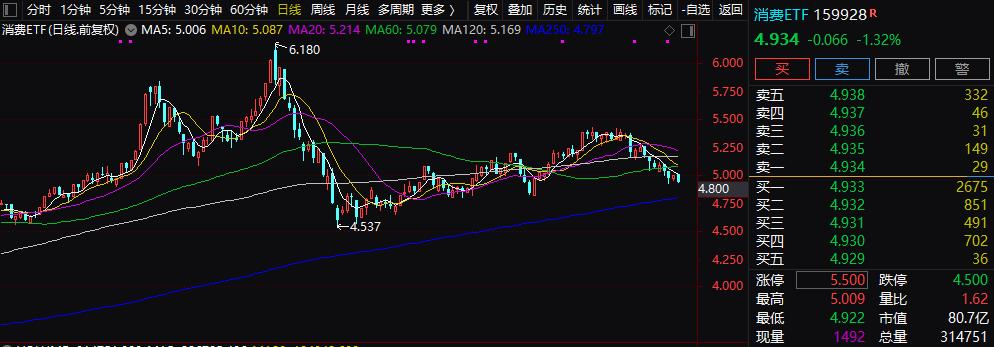 由于白酒杀跌,整个消费板块逆市走低,同时也压制了指数的表现,贵州茅台、山西汾酒、舍得酒业、海天味业等贡献了不少跌幅,就连早盘冲高的片仔癀也被带绿。其实,从走势来看,整个消费板块近期的走势已经明显走弱。