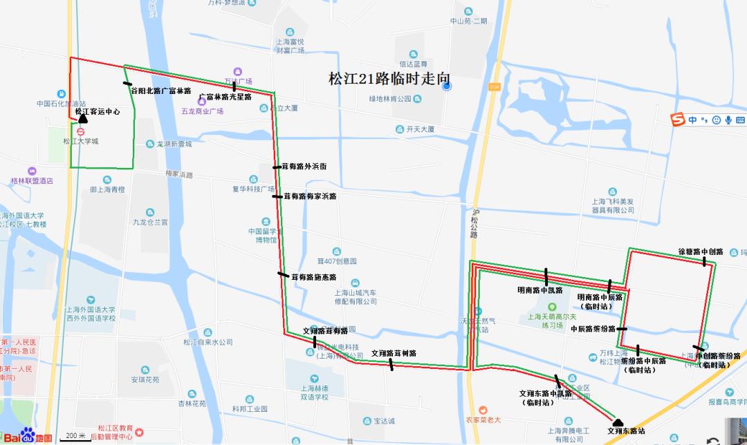 临时走向:(上行)自松江客运中心起经嘉松南路、广富林路、茸梅路、文翔路、沪松公路、明南路、中辰路、徐塘路、中创路、缤纷路、中辰路、明南路、沪松公路、文翔东路至文翔东路站。(下行)自文翔东路站起经文翔东路、沪松公路、明南路、中辰路、缤纷路、中创路、徐塘路、中辰路、明南路、沪松公路、文翔路、茸梅路、广富林路、谷阳北路、梅家浜路、嘉松南路至松江客运中心。