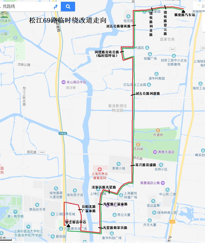 临时走向:(上行)自松江客运中心起经嘉松公路、广富林路、谷阳北路、梅家浜路、光星路、淡家浜路、茸悦路、茸兴路、刘五公路、沈砖公路、洞德路、王家厍路、刘五公路、德悦路至横港路汽车站。(下行)自横港路汽车站起经德悦路、刘五公路、王家厍路、洞德路、沈砖公路、刘五公路、茸兴路、茸悦路、淡家浜路、光星路、梅家浜路至松江客运中心。