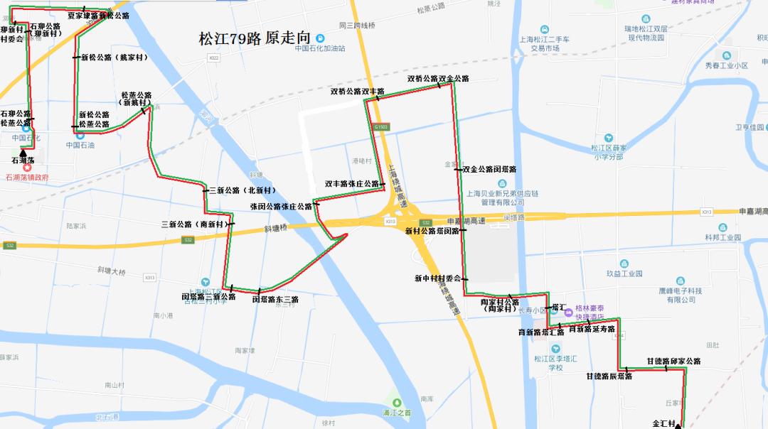 原走向:自石湖荡起经东栅路、石湖新路、石泖公路、夏家埭路、新松公路、松蒸公路、大东浜公路、三新公路、闵塔路、张闵路、张庄公路、双丰路、双桥公路、双金公路、新村公路、陶家村公路、塔汇公路、育新路、辰塔路、甘德路、长东公路至金汇村。