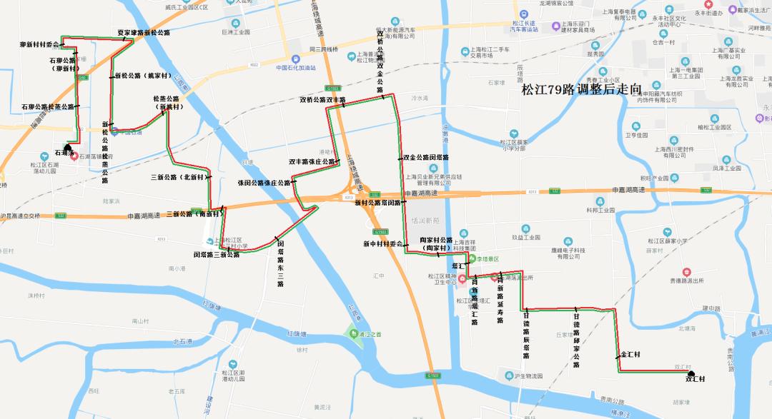 调整后走向:自石湖荡起经东栅路、石湖新路、石泖公路、夏家埭路、新松公路、松蒸公路、大东浜公路、三新公路、闵塔路、张闵路、张庄公路、双丰路、双桥公路、双金公路、新村公路、陶家村公路、塔汇公路、育新路、辰塔路、甘德路、长东公路、双汇公路至双汇村。
