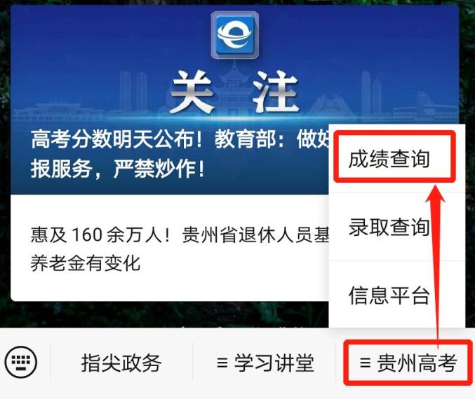 关注贵州省教育厅政务微信“贵州教育发布”(guizhou_edu),进入微信下方菜单栏“贵州高考”—“成绩查询”,正确输入考生个人信息进行查询。
