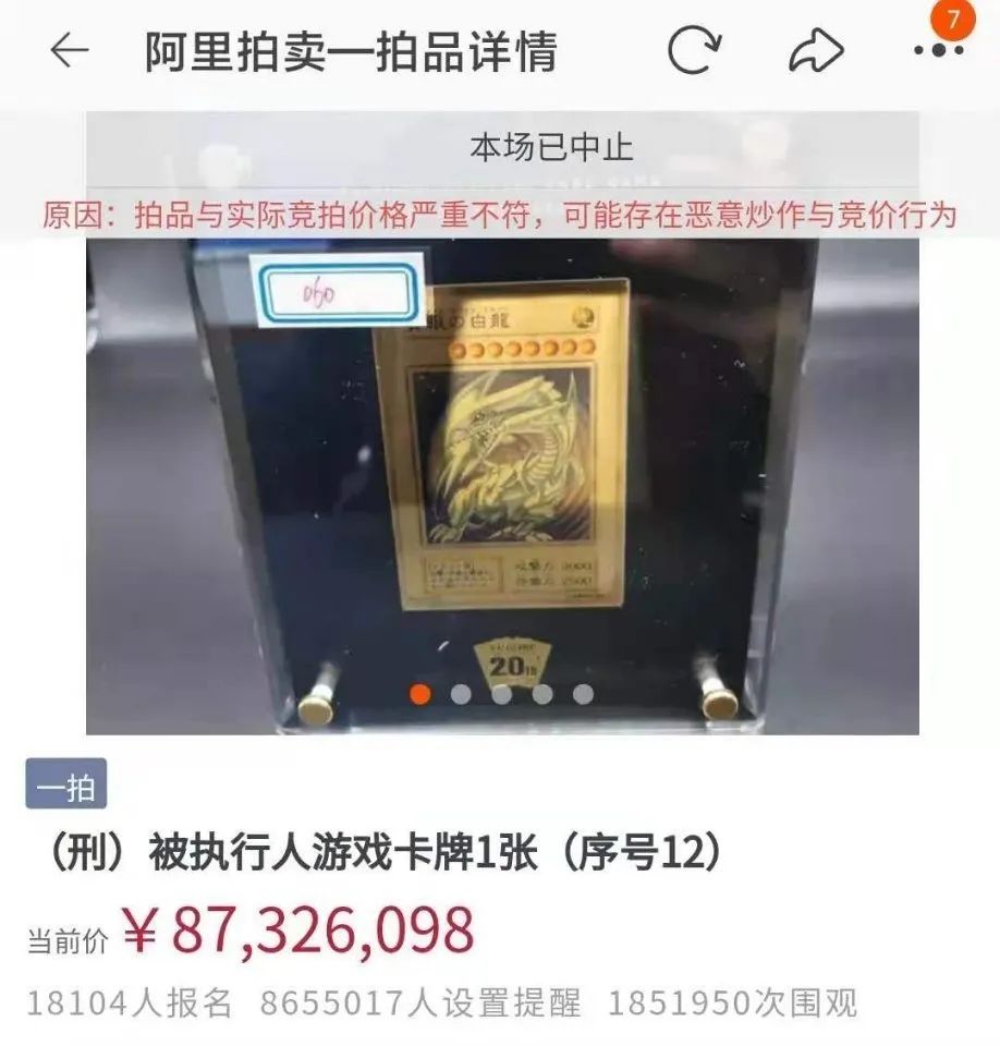 然而,上述“青眼白龙”金卡开拍后不久,拍卖价格一路飙升至87326098元。随后,此场拍卖便由于拍品与实际价格严重不符,可能存在恶意炒作与竞价行为而被中止。
