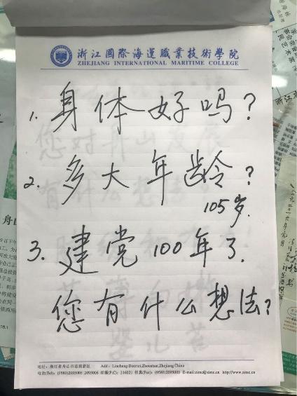 因为年龄的原因,王老先生的听力略微有些下降,于是家人为我们拿来了纸和笔,方便交流。当谈及今年是建党一百周年了,有何感想时,老人略显激动。他说:“两个一百年!”说着颤颤巍巍拿起笔,坚定地写下了“党有党的两个一百年!”,嘴上还说着,“党的两百年会更好!”这是一个见证了两个世纪的老人对党的坚定信念。