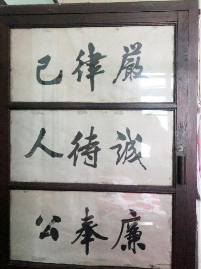 我们和王老交流了不少时间,怕打扰老人休息,准备起身告辞时,王老示意我们楼上还有两个房间的照片墙可以去看看,于是我们有幸踏进了这位传奇老人的房间。房间装修得很简单,一张床,一个大柜子,一把椅子,唯一的装饰就是照片和书法。柜子上半截是玻璃推拉门,老人自己写了幅字贴着,“严律己 诚待人 廉奉公”,柜子的侧边用钉子简单固定,用老式的夹子分门别类挂了一摞摞的书信文件。床边更是贴了一个大大的“忍”字。想起王老家人告诉我们老人家性格内向,有些难处、苦处从来不跟人说,这是老一辈革命人的缩影,是他们将红色基因刻进骨肉、融进血脉的体现!