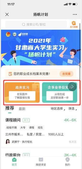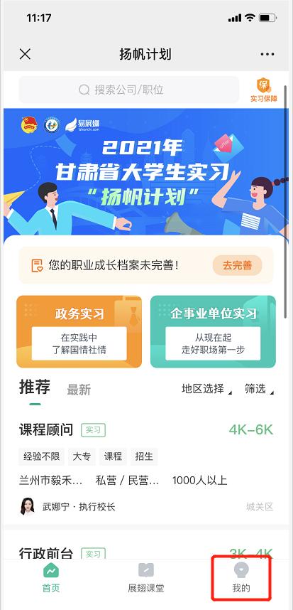 个人职业成长档案完成之后,即可首页【政务实习】或【企事业单位实习】选择心仪实习岗位投递。若职业成长档案完善度未达到80%,按照系统提醒即可。可在【我的】页面查看投递进度。