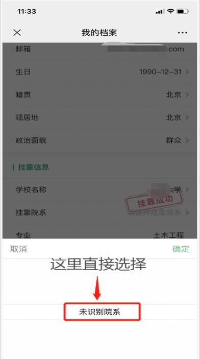 完成注册之后按照提醒步骤完成个人信息录入和学校挂靠。在【学校挂靠】步骤,输入学校名称关键字,选择对应的学校和二级院系即可。(目前各学校还未创建二级院系,请选择【未识别院系】,后续随时可在【您的职业成长档案】进行更改)