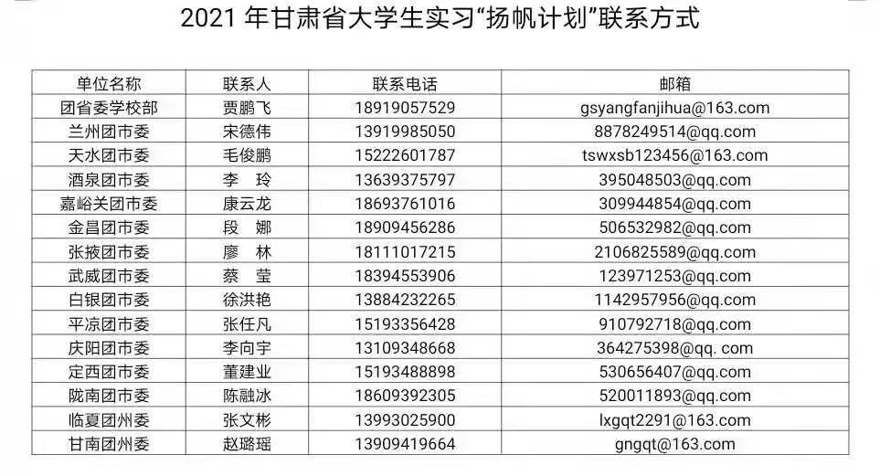 确定人选:实习单位根据实际情况采用适当方式择优选定实习生。7月12日前,市(州)团委汇总本地区实习单位实习生信息后,将《2021年“扬帆计划”市(州)政企实习人员名单汇总表》盖章扫描件和电子版发送至指定邮箱:gsyangfanjihua@163.com。