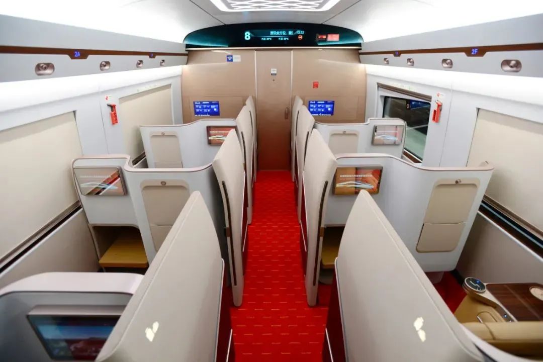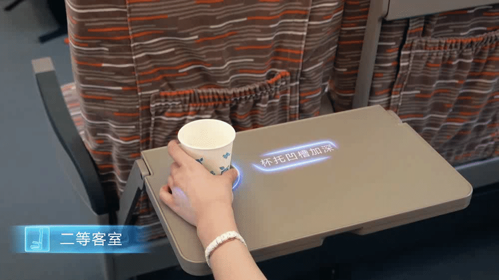 一等座椅增加了可调节头靠、电动腿靠等,将原来设置在座椅扶手上的小桌板改为设置在前排座椅靠背上。