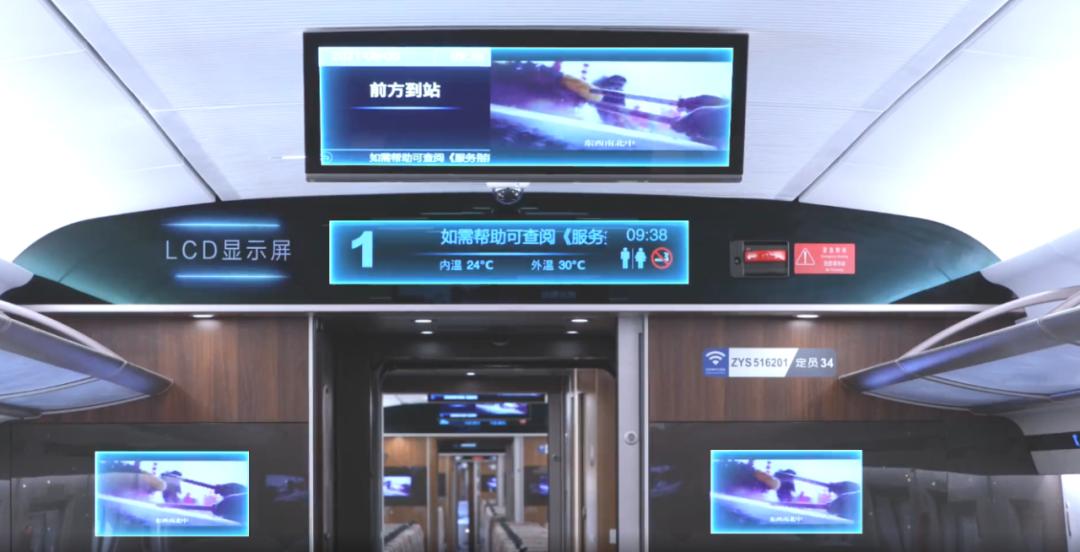 配备了支持手机投屏功能的智能交互终端,可为旅客提供丰富的娱乐节目、运行信息等服务。