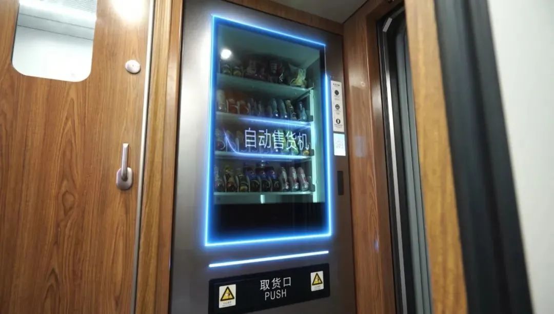 餐车增设1台自动售货机,可为旅客提供自助购买水果、饮料、零食等服务。