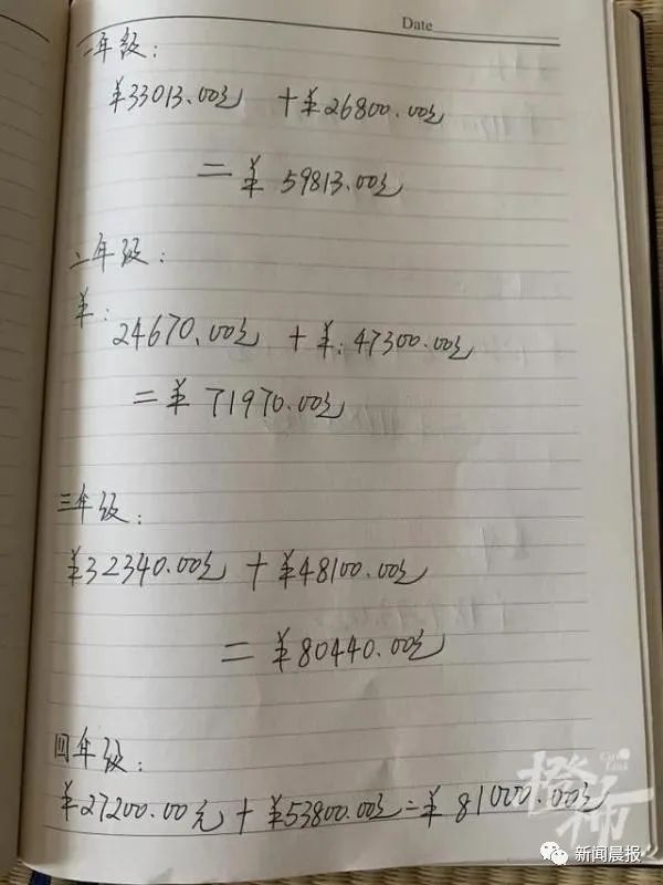 “一年级是5.9万元左右,二年级7.2万元左右,三年级8万元左右,四年级8.1万元左右。五年级因为疫情影响,很多兴趣班改为线上,另外一些上门的老师有段时间不能前来,费用稍微节省了一些,花了7.9万元。六年级因为要考级,再加上很多培训费用都在涨价等,支出变多,花了11.7万元。”