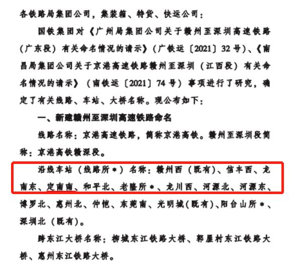 近日,国铁集团下发了《国铁集团关于公布赣州至深圳高速铁路有关名称的通知》,新建赣深高铁线路和沿线车站名称正式确定。