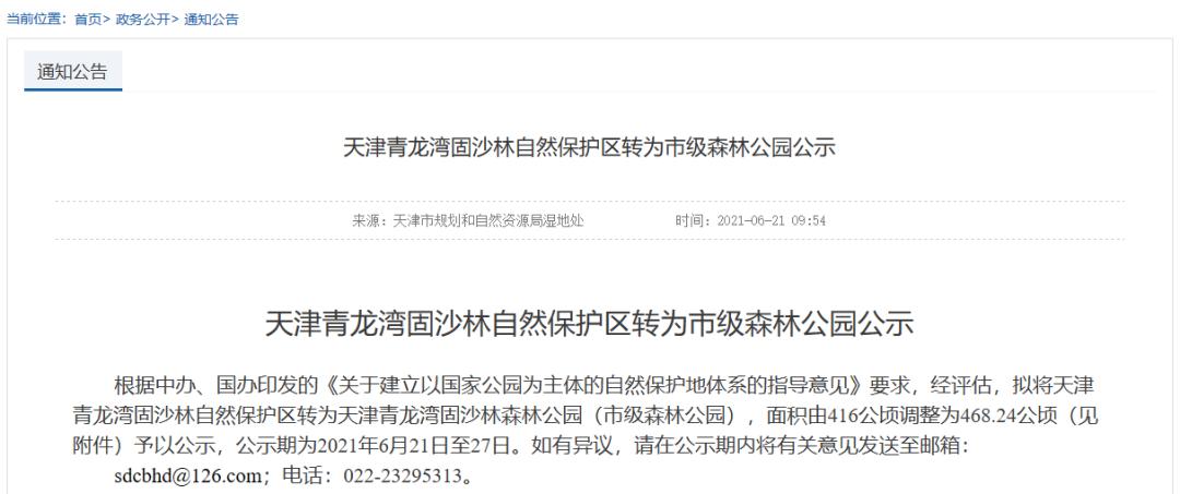 天津市规划和自然资源局发布公示,拟将天津青龙湾固沙林自然保护区转为天津青龙湾固沙林森林公园(市级森林公园),面积由416公顷调整为468.24公顷。