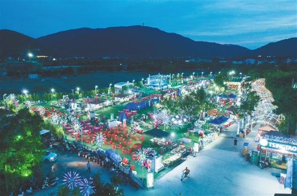 说话间,一辆辆小推车发出哐哐当当的声音由远及近,越来越多的村民准备营业。夜幕降临,博后夜市张灯结彩,人头攒动,百余个摊位有序排开,传统手工艺品、黎族特色织品等商品琳琅满目。三五成群的游客涌进夜市,被应季水果、海南小吃、海鲜烧烤等特色美食“俘获”。