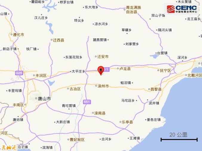 6月24日5时17分在河北唐山市滦州市发生3.0级地震,震源深度11千米,震中位于北纬39.83度,东经118.74度。