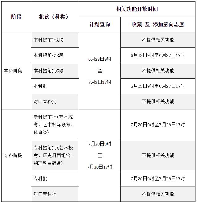 注:①此表所列时间为志愿辅助系统各批次(科类)相关功能的开放时间,不是志愿填报时间,请考生注意。