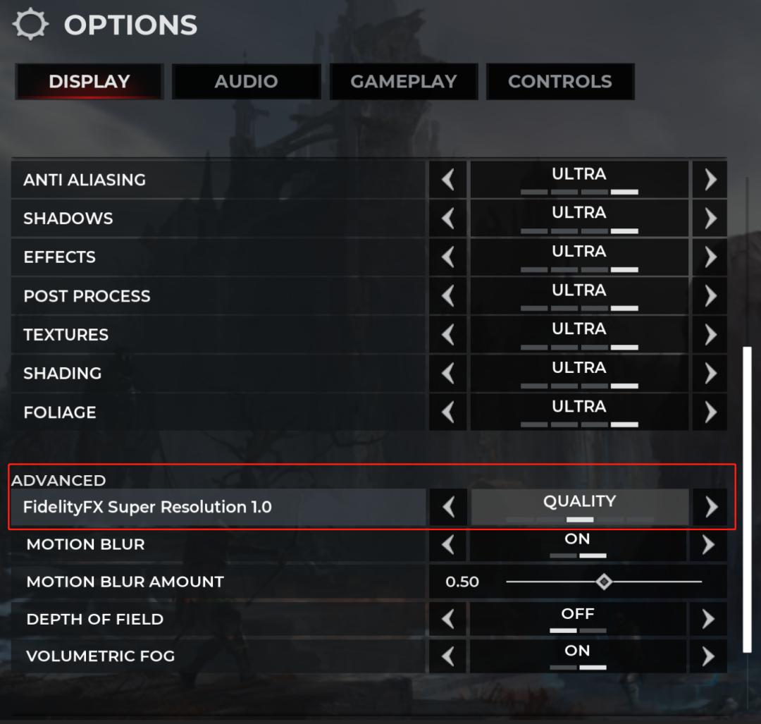 进到游戏的图像测试界面,啥驱动都不用更新,就能看到 FSR 1.0 的选项,一共有五个档位提供给玩家挑选。
