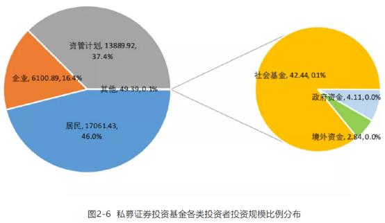 报告显示,截至2020年末,私募证券投资基金的各类型投资者中,居民投资者数量占比达87.8%,私募证券基金净资产中,居民持有1.71万亿元,较2019年末增长89.8%,在私募证券基金净资产中占比46.0%,同比增加2.56个百分点。私募证券基金以居民投资者为主,居民资金占比增加,但企业资金占比下降。