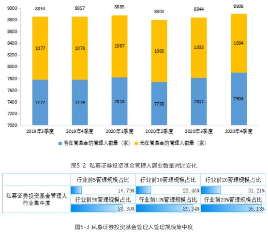 与此同时,行业排名前20的私募股权、创投基金管理人管理规模占比12.7%,较2019年末上升0.07个百分点;行业排名前20%的管理人管理规模占比达90.3%,较2019年末下降0.14个百分点。