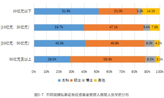 有意思的是,“80后”成为证券私募行业高管的主力军,且私募高管人员学历越高管理规模越大,高管从业10年以上者占比超七成。但股权创投私募高管则以“7080后”为主,且普遍高学历,硕博占49%。
