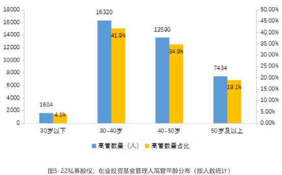 报告显示,从高管年龄分布来看,截至2020年末,私募股权、创业投资基金管理人高管年龄主要集中在30至50(不含)岁,占比76.8%,其中年龄在30至40(不含)岁的青壮年人士,成为私募股权、创业投资从业的中坚力量,占全部高管数量的比例达41.9%。