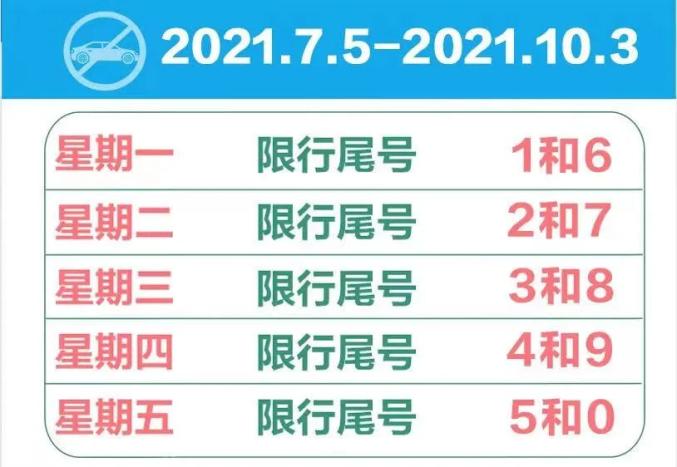 按照北京和天津实施的限行规定,2021年7月5日起,新一轮尾号限行即将开始,我省多地也将跟着限行轮换。2021年7月5日至2021年10月3日,星期一至星期五限行机动车号牌尾号分别为1和6、2和7、3和8、4和9、5和0。
