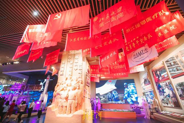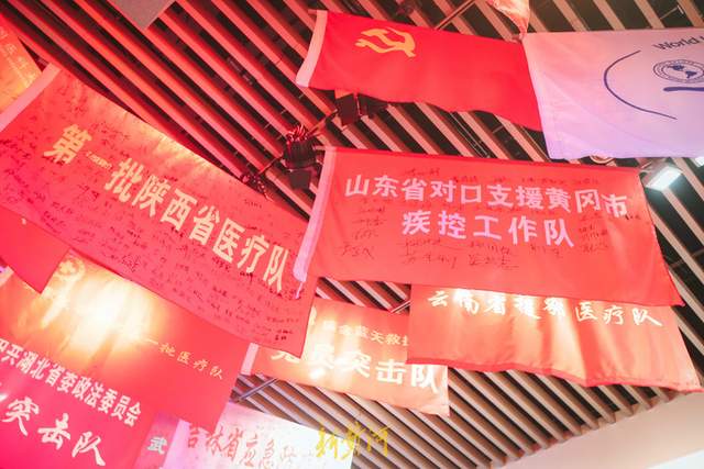 为了展示全国人民万众一心、众志成城的抗疫精神,展览馆内还妥善保存着部分抗疫见证物,包括数十面各省市援鄂医疗队旗帜,其中就有“山东省对口支援黄冈市疾控工作队”旗帜。这面旗帜是山东医疗队员们在前线日夜奋战留下来的实物见证,是医护人员舍生忘死,救死扶伤精神的载体和缩影。