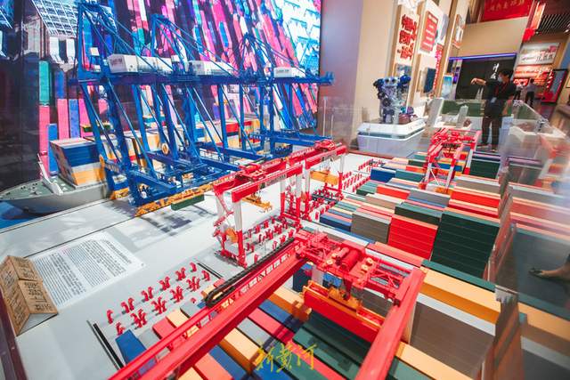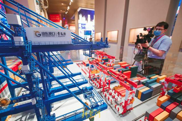 在展馆的大国重器展区,山东港口青岛港全自动化集装箱码头模型格外醒目。该模型的自动化吊桥、轨道吊、AGV均按照1:75比例缩放制作,实现了整个自动化码头作业的全过程演示。此外,模型上方还配有6*5平方米的屏幕,循环播放自动化码头全景作业视频,全面展现了山东港口青岛港自动化码头风采。山东港口青岛港全自动化码头高度融合工业互联网、物联网、5G、大数据、云计算、人工智能等先进技术,国际首创“氢+5G”智慧绿色发展模式为全球港航业提供中国样本。