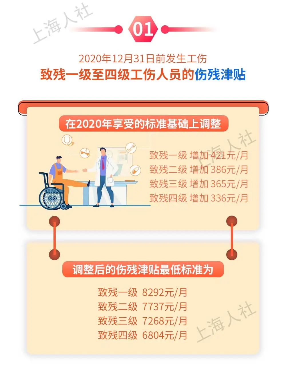 2020年12月31日前发生工伤且致残一级至四级工伤人员的伤残津贴在2020年享受的标准基础上调整:其中致残一级增加421元/月,致残二级增加386元/月,致残三级增加365元/月,致残四级增加336元/月。调整后的伤残津贴最低标准为:致残一级8292元/月,致残二级7737元/月,致残三级7268元/月,致残四级6804元/月。