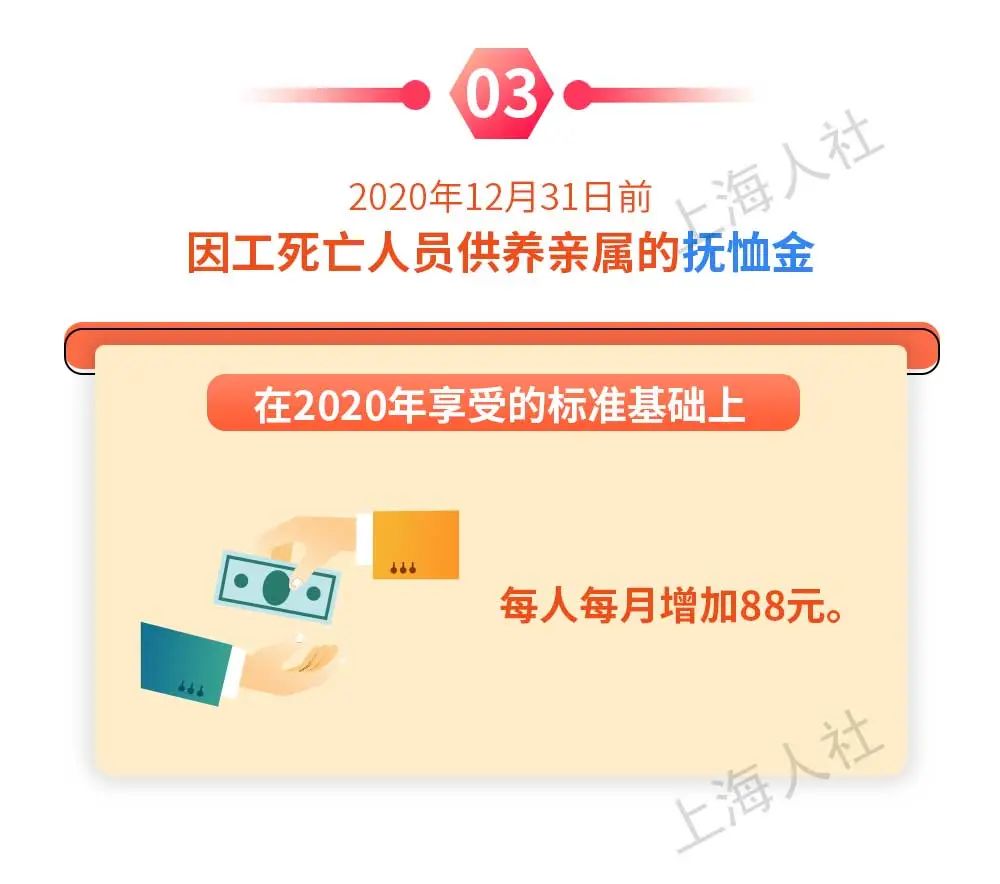 2020年12月31日前因工死亡人员供养亲属的抚恤金在2020年享受的标准基础上,每人每月增加88元。
