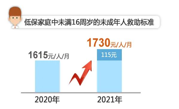 对最低生活保障家庭中未满16周岁的未成年人提高救助标准,从每人每月1615元调整为1730元,月增加115元。