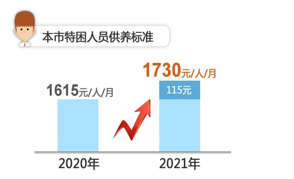 本市特困人员供养标准按照最低生活保障标准的1.3倍确定,从每人每月1615元调整为1730元,月增加115元。